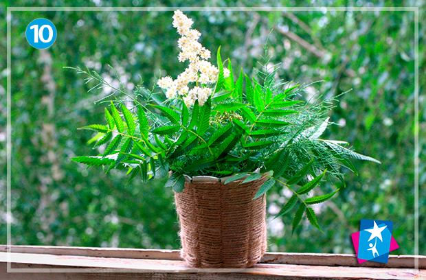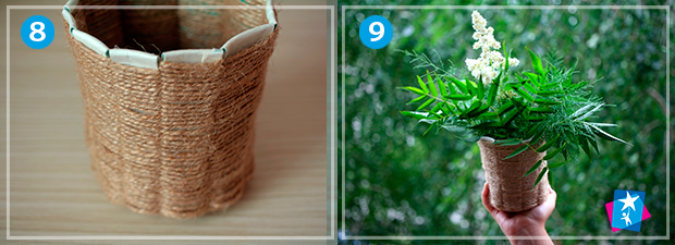 Оплітайте вазончик далі, до самого верху. Можна приклеїти горщику підвіс, або залишити, як є. Ось так легко ваші рослинки отримають стильні декоративні кашпо у натуральних кольорах.