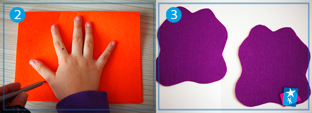 Рукавичка має відповідати розміру руки. Перенесіть розміри дитячої ручки на лист фетру. Контур зручно наносити маркером, акварельним олівцем або заточеною крейдою. Виріжте по дві однакові деталі для створення однієї рукавички. Нехай у кожного персонажу буде своя форма.