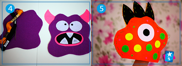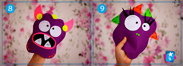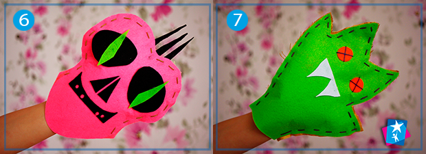 Потім на сторону лиця приклейте оченята, рот, зуби, ріжки, вії тощо. Їх можна вирізати з фетру або вишити нитками. Обидві частини зшийте по контуру контрастним швом «вперед голку». Можна замінити етап шиття на приклеювання деталей гарячим клеєм-пістолетом, але тоді викрійки зробіть трохи більшими. Не забувайте, що в нижній частині має залишитися отвір для руки.