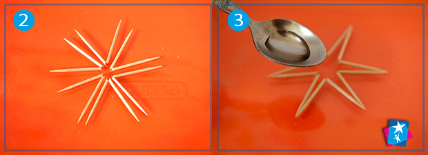 Зламайте посередині 5—6 зубочисток. Ламайте обережно, щоб вони не розділилися навпіл, а саме зігнулися. У вас вийдуть кутики. Викладіть їх у вигляді сонечка з променями назовні, як на фото 2.