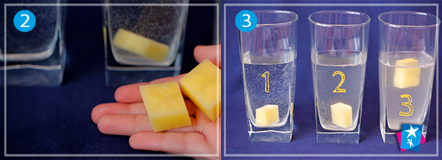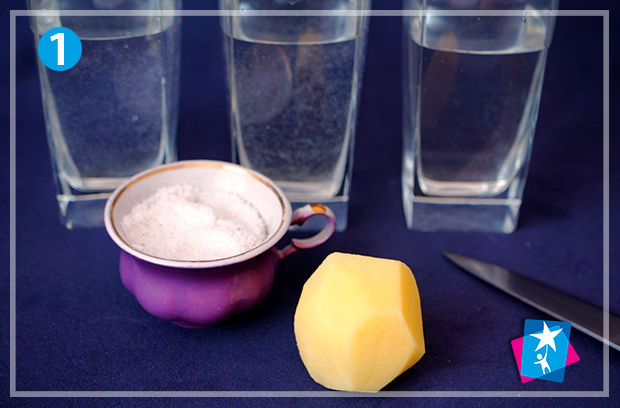 Картоплю почистіть і виріжте 3 однакових за розміром шматочки. Опустіть у воду. Ви одразу помітите, що у третьому стакані картопля підніметься на поверхню. Це знак того, що водний розчин солі щільніший.