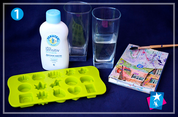 Наливаємо у прозорий стакан водичку. Потім додаємо дитячу олійку (можна взяти соняшникову олію або будь-яку іншу). Зразу бачимо, що олійка легша по питомій вазі, тому вона виходить на верхній шар. Також помічаємо чітку межу між речовинами і робимо висновок, що олія не розчиняється у воді.