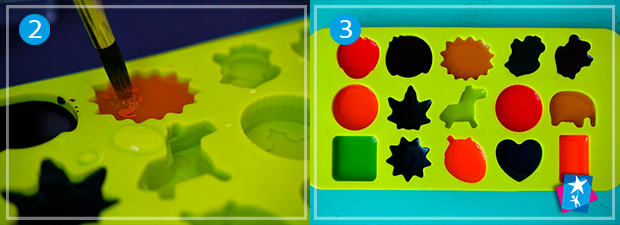 Заливаємо формочку для льоду водою та фарбуємо аквареллю у різні кольори. Підійде саме розчинна у воді фарба. Відправляємо формочки у морозильну камеру. Дістаємо, коли лід замерзне.