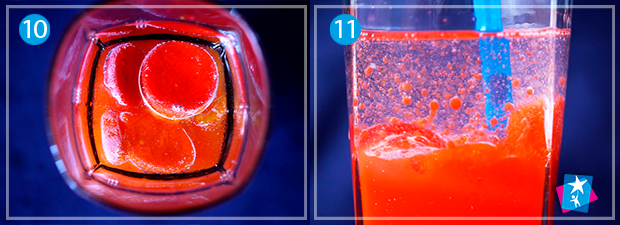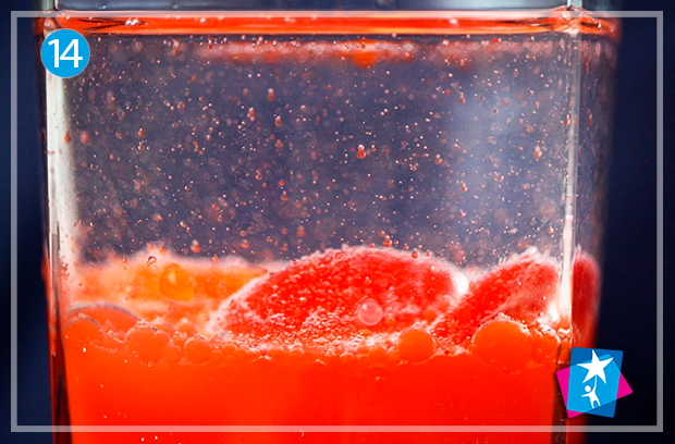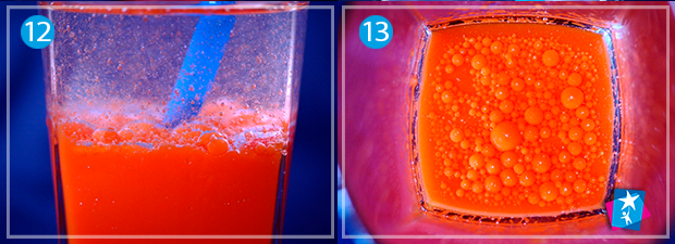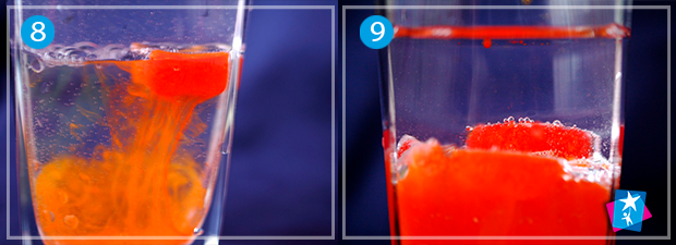 Далі найцікавіше: спробуємо трубочкою розмішати всі речовини у стакані. Акварельна вода підніметься в олійний шар, але не розчиниться, а перетвориться на кольорові бульбашки в маслянистій оболонці. Якщо залишити речовини у спокої, кольорові бульбашки знову опустяться в нижній шар через свою значну питому вагу.