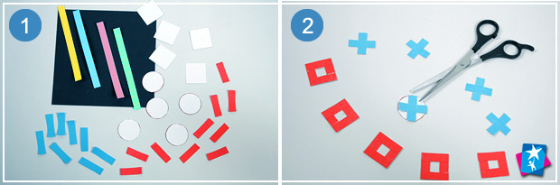 Почнемо зі створення фішок — нам потрібно 5 хрестиків і 5 нулів. На картонні кружечки наклеюємо перпендикулярно дві паперові смужки. Вирізаємо ножицями отримані хрестики, зміцнені картоном. На кожну квадратну картонну основу наклеюємо по периметру 4 червоні смужки. Вирізаємо макетним ножиком серединку в кожному квадраті — отримуємо стилізовані нулики на твердій основі.