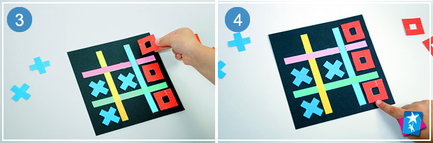 Тепер переходимо до ігрового поля. На яскравий аркуш паперу 15 на 15 см приклеїмо 4 довгі світлі смужки 13х1 см. Вони мають бути розміщені у вигляді фігури #. Усе, наша настільна гра готова. Можна пояснювати дитині правила та грати!