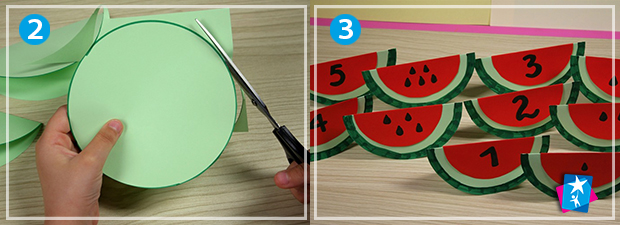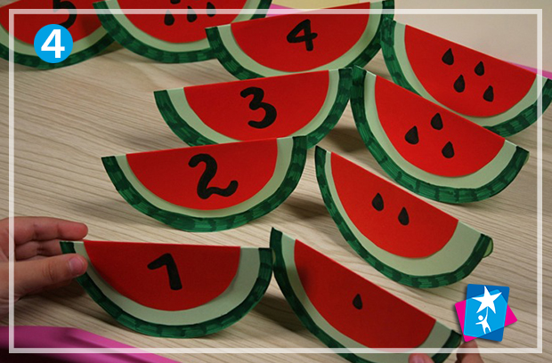 Наше завдання на пошук математичної відповідності складається з двох частин. Спочатку ми вирізаємо кола і складаємо яскраві саморобки у вигляді скибок кавуна, потім пишемо на них числовий ряд двома способами, а потім перемішуємо і шукаємо відповідності. В процесі виконання формується координація рухів, аналітичні і порівняльні навички, математична логіка.