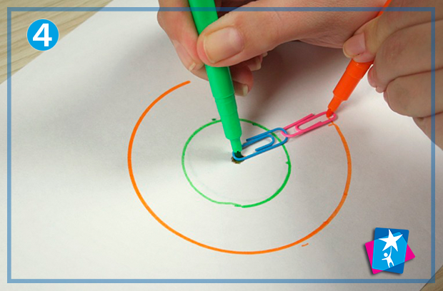Одна, дві чи три скріпки, поєднані між собою, допоможуть нам намалювати три кола з різними радіусами. Проект корисний для дітей, якщо вони хочуть швидко накреслити кола з діаметрами близько 4, 9 та 15 см (діаметр залежить від типу та розмірів скріпок). Високої точності ви не досягнете, але форма буде дотримана. Гарний досвід для любителів нестандартного підходу. Робота з одночасною взаємодією кількох фломастерів (олівців) та скріпок розвиває вправність дитячих рук.