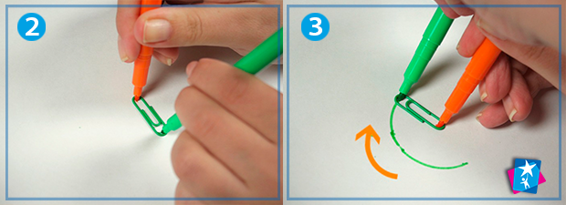 Отже, покладіть в центр аркуша скріпку. Візьміть фломастер і поставте вертикально на папір. Стержень повинен доторкатися до краю скріпки, а інший фломастер вставляється з іншого боку скріпки. Один фломастер ви маєте тримати непорушно, а інший провертати разом зі скріпкою, не змінюючи радіус кола. Ви можете рухатися по колу в той бік, куди вам зручно.