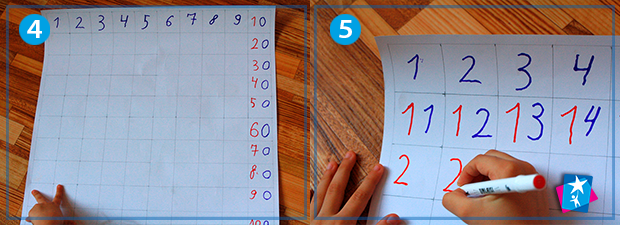 За допомогою лінійки, швацького метра або рулетки намітимо на рамці відрізки по 5 см та поєднаємо між собою. Допомагайте дитині розкреслювати сітку, тому що вона велика й може викликати труднощі. Потім приступайте до вписування чисел: десятки рекомендуємо прописувати червоним кольором, а одиниці – синім.