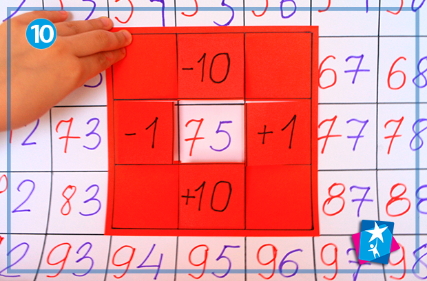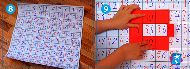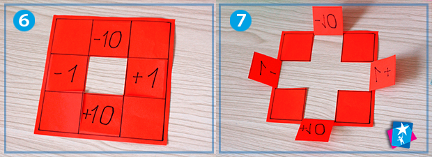 Можна зробити ще багато знахідок, але основну закономірність нам покаже віконечко з математичними діями. Виріжте квадрат із кольорового паперу розміром 16х16 см (по 0,5 см на рамку з кожного боку і 3х3 квадратних комірки висотою 5 см). Посередині створіть віконечко, зверху над ним напишіть «-10», знизу – «+10», зліва – «-1» і справа – «+1». Розрізи цих числових комірок мають бути зроблені до рамки.