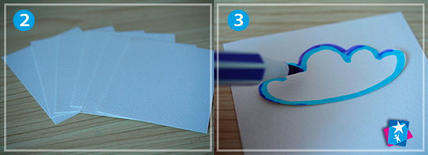 Розмітьте на аркуші міцного паперу прямокутники 8х10 см, виріжте основи для карток. Щоб весь набір був охайним, пропонуємо зробити трафарет хмаринки і обводити його на всіх картках.