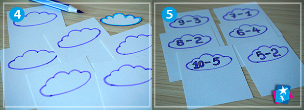 Після наведення контуру хмари у верхній частині кожної картки, запишіть всередині приклад на віднімання (див. мал. 5).