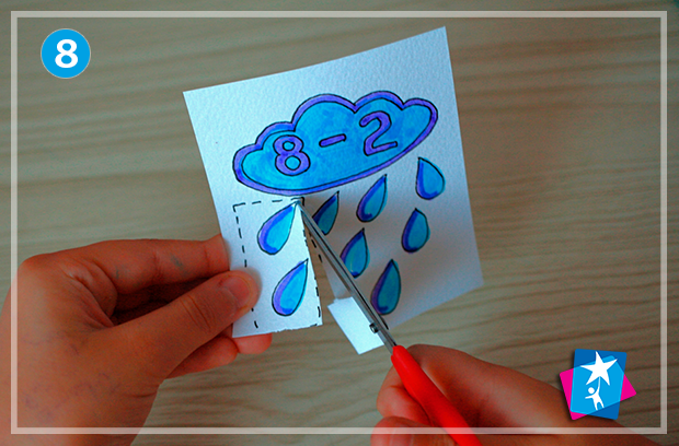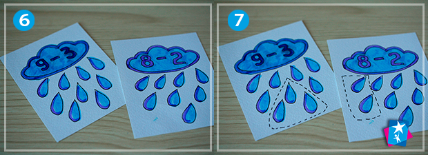 Далі вималюйте під кожною хмаркою з прикладом краплі дощу. Їх кількість відповідає зменшуваному (найбільшому числу у виразі). Після цього передайте картку дитині і попросіть зачитати вираз уголос. А потім гравець має обвести краплі, які треба відняти (від’ємник) — в проекті це пунктирні ділянки на фото 7. Їх треба вирізати ножицями і подивитись на картку.