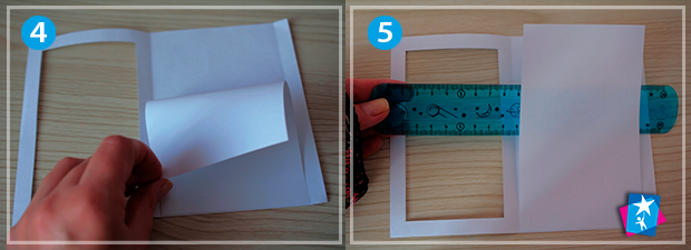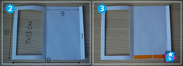 Від формату А4 відріжте прямокутник 19х15 см. По довжині поділіть на відрізки 9+9+1 см та зробіть лінії згину. На лівому розвороті зробіть віконце 13х7 см, залишивши рамочку по 1 см з кожної сторони. На правому розвороті у нижній частині приклейте двосторонній скотч (див. мал. 3).