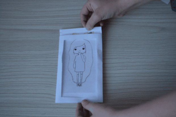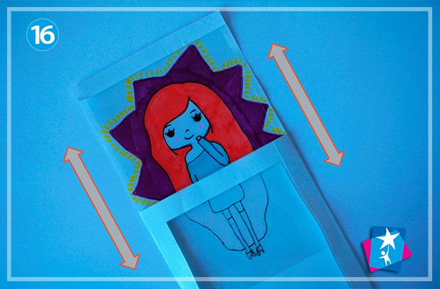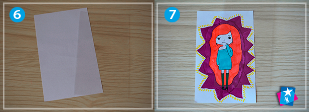 І підготуйте ще один листочок паперу 15х9 см і такий же прямокутний шматок ацетатної плівки (плівку можна замінити прозорою пластиковою упаковкою або канцелярським файлом). На папері намалюйте кольорову ілюстрацію на будь-яку тему. Її контури мають бути чіткими, не дуже складними. Обведіть контури чорним кольором. Покладіть зверху плівку.