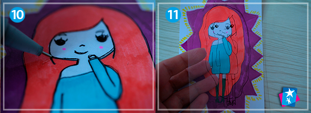 Далі залишається перенести на прозору плівку контури картинки — чорним кольором. Потрібно робити це охайно, щоб контури точно співпадали. У нас виходить чорно-білий малюнок на плівці, і кольоровий — на папері (див. фото 11, 12).