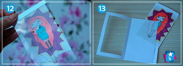 Вкладаємо цю листівку у кишеньку паперової конструкції, яку ми зробили раніше. Вкладаємо так, щоб прозорий шар з чорним контуром опинився зверху, а кольоровий сховався у кишеньку.