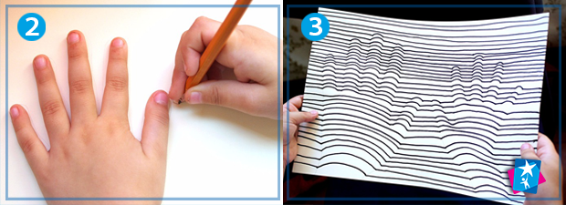 Обведіть простим олівцем дві руки: свою та дитячу. Лінії краще робити малопомітними. Візьміть маркер і проведіть горизонтальну лінію. Коли ця лінія дійде до контуру руки, починайте створювати об’єм. Уявіть, що ви "погладжуєте" руку, неначе вона справді об'ємна. Дійшли до зовнішнього контуру руки — знову змініть напрямок лінії: тепер вона знову йтиме горизонтально.