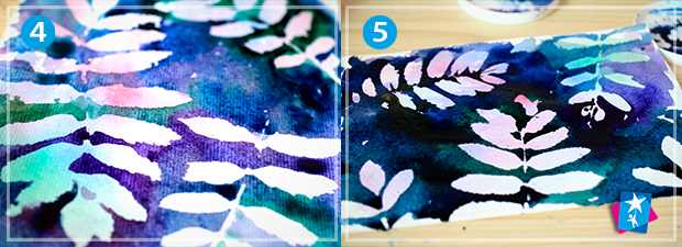 Техніка №1 — Маскування. Підготуйте на палітрі кілька світлих відтінків. Змочіть аркуш, а потім нанесіть пензликом світлий фон. Висушіть перший шар, можна прискорити процес феном. Потім красиво викладіть листочки на тоненьких гілочках. Вони замаскують світлі ділянки, а ви тим часом підготуйте темні насичені фарби. Починайте вкривати темною фарбою фон, не зрушуючи листочки з місця. Акварель має бути не сухою і не дуже текучою, щоб фарба одночасно красиво лягала, і при цьому не підтікала під листя. Приберіть листя, підсушіть новий шар і за допомогою лайнера наведіть контури і промалюйте тоненькі прожилки.