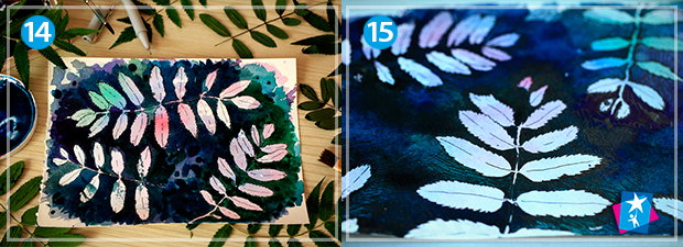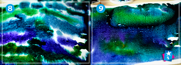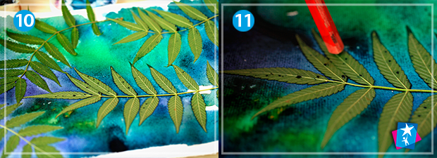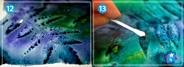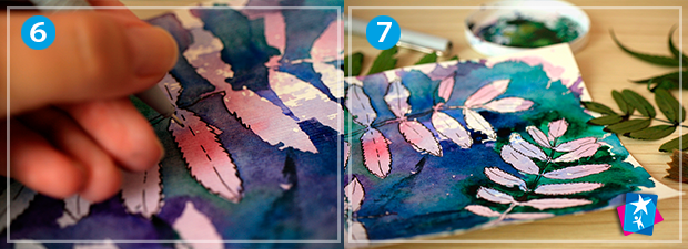Техніка №2 — Вбирання. В першому варіанті нашої творчої роботи ми прикрили світлий фон і отримали світлі листочки, а в цьому будемо працювати навпаки. Нанесемо по всій поверхні воду, поставимо кілька темних різнокольорових плям аквареллю. Покрутимо аркуш, щоб кольори злилися (див. фото 6, 7). Великі водяні підтьоки можна прибрати серветкою, а далі на вологий фон вкладаємо гербарій та притискаємо кінчиком пензлика. Частина фарби одразу вбереться в листя, а простір під ними просвітліє. Тепер залишається забрати наші «промокашки» з фону, підсушити роботу ватними паличками в потрібних місцях (де хочеться більше висвітлити акварель). Сушимо роботу феном і наводимо лайнером потрібні елементи.