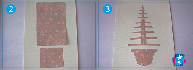 Складіть більший прямокутник по осі симетрії, виріжте з нього видовжений трикутник та намалюйте половинку ялинкового стовбура з гілками. Робіть це схематично, все одно цей каркас буде закритий фарбами. Виріжте, як витинанку, та розгорніть. Приклейте до основи. Те ж саме проробіть з нижньої частиною композиції — виріжте горщик для рослини, приклейте.