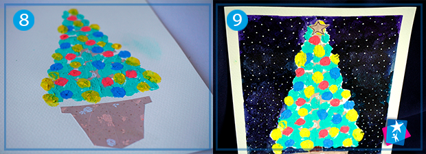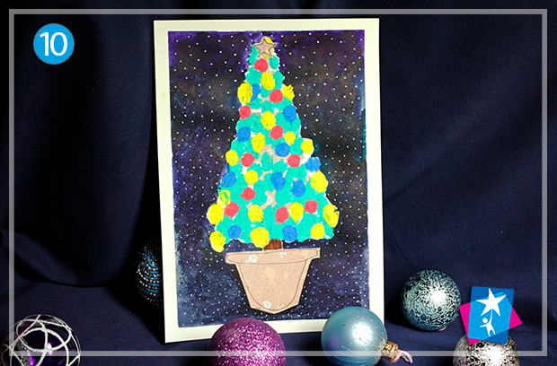 Тепер вмочіть палець у зелену пальчикову фарбу та починайте наносити плямки на каркас — це будуть гілочки. Коли зелений шар висохне, приступайте до нанесення червоних, синіх та жовтих кружечків. У фіналі можете приклеїти зверху зірочку і зробити темний фон зі снігом. Для цього будь-якою темною фарбою замалюйте фон та дайте йому висохнути. А потім нанесіть білим маркером або об'ємним контуром (для скла чи тканини) багато маленьких крапочок-сніжинок.