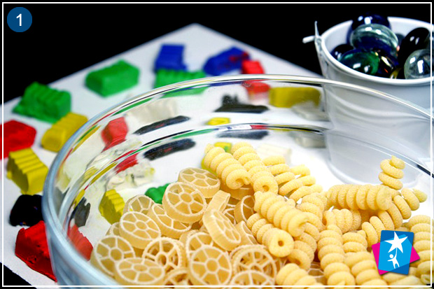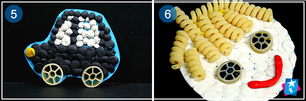 Придумайте ідею для пластилінової мозаїки, відштовхуючись від наявних матеріалів. Штучні прозорі камінці підходять для того, щоб викласти панцир черепахи, а круглі макарони нагадують колеса автомобіля і очі. Макарони у формі завитків ідеально зімітують кучері ляльки.