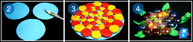 Для створення черепахи прикріпляйте кульки різних кольорів зверху на папір круглої форми. Створіть панцир — притисніть декілька камінців або ґудзиків. Знизу прикріпіть лапи з пластиліну та голову черепахи з очима.