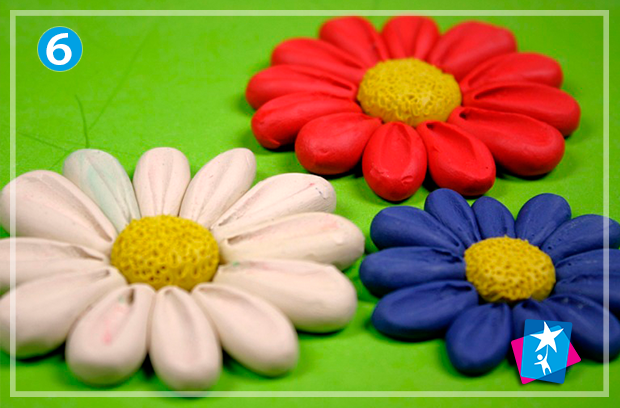 Скатайте кульку із пластиліну жовтого кольору і вкладіть на папір, трохи сплюсніть. Це буде серединка майбутньої квітки. Тепер скатайте 12 менших кульок однакового розміру іншого кольору, наприклад, білого. З кожної сформуйте краплевидну пелюстку та прикладайте до серцевини симетрично: зверху і знизу, справа і зліва. Далі заповнюйте простір, що залишився, вкладаючи пелюстки під кутом 180⁰.