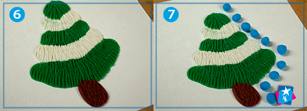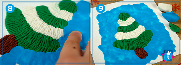 Візьміть по шматочку коричневого, зеленого та білого пластиліну. Трохи розімніть. Сформуйте маленьку темну кульку та викладіть на місце стовбура ялинки в нижній частині роботи посередині. Потім таким же чином викладіть зелену смужку, але горизонтально, — це будуть нижні гілочки ялини. Далі йде схожа смужка білого кольору, але трохи коротша. Далі чергуйте зелені й білі кольори, поступово їх звужуючи до верху. Так ми поступово сформуємо ялинку.