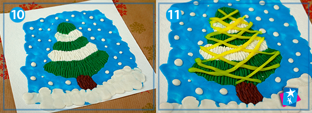 Тепер залишилося нанести сніг — для цього формуємо маленькі кульки різного об’єму. Частину з них наносимо на фон, більші — в нижню частину роботи, де мають бути снігові кучугури. Тепер скрутіть тонесенькі ковбаски з жовтого пластиліну та вкладіть їх замість гірлянд. А далі сформуйте кульки середнього розміру із рожевого пластиліну та прикрасьте новорічне деревце іграшками. Для кращого ефекту можна нанести на іграшки світлі відблиски.