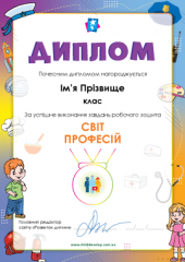 Після опрацювання зошита ви можете нагородити дитину спеціальним дипломом, який стане відзнакою за старанне і вправне виконання завдань та підтвердить набуття таких необхідних для подальшого навчання поведінкових навичок, як старанність, охайність і самодисципліна.