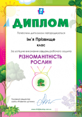 Після виконання завдань робочого зошита ви можете нагородити дитину спеціальним дипломом, що підтверджуватиме засвоєння теми «Різноманітність рослин».