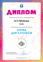 Після виконання програми ви можете нагородити дитину спеціальним дипломом, який стане нагородою за старанне та вправне виконання завдань на розвиток логічного мислення й підтверджуватиме набуття дитиною таких необхідних для подальшого навчання поведінкових навичок, як старанність, охайність і самодисципліна.