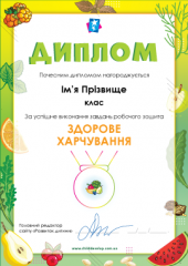 Після виконання завдань робочого зошита ви можете нагородити дитину спеціальним дипломом, який стане відзнакою за старанне і вправне опрацювання завдань та підтвердить набуття таких необхідних для подальшого навчання поведінкових навичок, як старанність, охайність і самодисципліна.