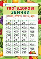 Зошит містить два календарі здорових звичок: «Контролюю споживання цукру» і «Фрукти й овочі щодня», що розраховані на місяць спостережень за власним харчуванням. Щоденне нагадування про потребу впродовж дня якісно і збалансовано харчуватися сприятиме формуванню в дитини здорових харчових звичок, уміння аналізувати власний раціон із погляду його користі для здоров’я.