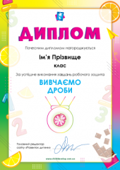 Після виконання завдань зошита ви можете відзначити дитину спеціальним дипломом, який стане нагородою за старанне та вправне виконання завдань і підтверджуватиме набуття таких необхідних для подальшого навчання поведінкових навичок, як старанність, охайність і самодисципліна.
