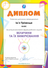 Після виконання завдань робочого зошита ви можете нагородити дитину спеціальним дипломом, який стане відзнакою за старанне і вправне виконання завдань та підтвердить набуття таких необхідних для подальшого навчання поведінкових навичок, як старанність, охайність і самодисципліна.