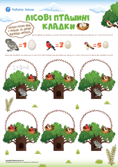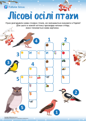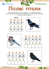 Тематична добірка завдань для дітей від 6-ти років, що поглибить знання про лісових птахів, спосіб їхнього існування в природному середовищі, розвиватиме логіку, увагу, мислення та фантазію. Зошит містить такі завдання: анаграми, кросворди, домальовування, графічні диктанти, аплікації, загадки, приклади, читання слів і мінітекст. Завдання спрямовані на розвиток логічного мислення, мовлення, уяви й дрібної моторики. У процесі виконання завдань дитина старшого дошкільного віку потренує спостережливість, уважність, зорове сприйняття й просторове мислення в середовищі лісу, формуватиме наполегливість, розвиватиме цікавість до навчання та самостійність, а також позитивне ставлення до пізнавальної діяльності. Завдання допоможуть зміцнити впевненість у власних силах і створять міцне підґрунтя для подальшого навчання в школі. Також завантажуйте додатково Птахи – картки Домана, Перелітні птахи – інформаційний плакат-наочність та Осілі птахи – інформаційний плакат-наочність.