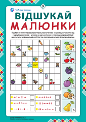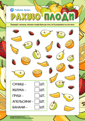 Тематична добірка завдань для дітей від 6 років спрямована на поглиблення знань про фрукти та ягоди, розвиток математичних компетенцій, логіки, уваги і мислення. Виконуючи завдання робочого зошита, малюки працюватимуть із графічним диктантом, розв’язуватимуть логічні задачі, проводитимуть експеримент, писатимуть, рахуватимуть, вивчатимуть геометричні фігури, малюватимуть, розмальовуватимуть, навчатимуться читати, створюватимуть мозаїку, розгадуватимуть кросворди й загадки. Ця діяльність допоможе дітям учитися розрізняти особливості фруктів і ягід, тренувати зоровий гнозис та увагу, вдосконалювати навичку узагальнення й систематизації знань, розвивати зорово-рухову координацію. Також малеча опановуватиме вміння міркувати і мислити логічно, закріплюватиме навик лічби, потренує дрібну моторику, дізнаватиметься про просторові поняття «ліво» та «право», учитиметься писати, тренуватиме навичку вирізання ножицями з паперу, створюватиме картину з елементів, проводитиме дослідницьку діяльність, розвиватиме міжпівкульну взаємодію. Пропонована добірка завдань сприятиме формуванню в дитини старшого дошкільного та молодшого шкільного віку любові до довкілля та навчання, стане основою корисного дозвілля. Додатково радимо завантажити Фрукти: плакат-наочність для дітей, Фрукти – картки Домана, Їстівні ягоди – картки Домана та Обведи контур і розмалюй фрукти та ягоди.