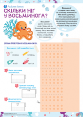 Тематична добірка завдань для дітей від 6-ти років, створена спеціально для допитливих дітей молодшого шкільного віку та їхнього ознайомлення з дивовижними істотами, які живуть у водному світі. Завдання робочого зошита спрямовані на розвиток уваги, логічного мислення, дрібної моторики. Виконуючи завдання, діти малюватимуть, домальовуватимуть і розмальовуватимуть, складатимуть та писатимуть слова, вирізатимуть, власноруч виготовлятимуть іграшку, читатимуть склади, слова й мінітексти, працюватимуть із пазлами і танграмом, розгадуватимуть кросворд, розв’язуватимуть логічні завдання, виконуватимуть вправи на орієнтацію в просторі. Така ігрова та пізнавальна діяльність не тільки допоможе здійснити уявну мандрівку підводним світом, а й формуватиме в дітей старшого дошкільного та молодшого шкільного віку графомоторні навички, вдосконалюватиме вміння користуватися ножицями, діти опановуватимуть техніку скручування паперових стрічок, поліпшуватимуть уміння зосереджуватися. Є у зошиті і завдання на розчитування, розвиток уваги, зорового гнозису та мислення, формування елементарних уявлень про математичне поняття кількості. Опрацьовуючи завдання зошита, діти зможуть закріпити знання про напрямки «уліво — вправо», «вгору — униз», розвиватимуть уяву, фантазію та креативність. Робота із зошитом формуватиме в малечі любов до довкілля та навчання, дасть змогу корисно провести час. Додатково завантажуйте Морські жителі – картки Домана та Мешканці прісних водойм – картки Домана.