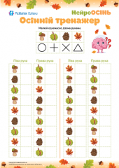 Тематична добірка завдань для дітей від 6 років спрямована на поглиблення знань про осінь та особливості цієї пори року, допоможе вивчати назви осінніх місяців, тренуватиме уяву, мислення, пам’ять і креативність. Виконуючи завдання робочого зошита, малюки працюватимуть із нейровправами, гратимуть у настільні ігри, лічитимуть, створюватимуть аплікацію, виконуватимуть графічні диктанти, читатимуть, писатимуть, малюватимуть, розмальовуватимуть по цифрах, гратимуть у шукалку, дізнаватимуться цікаві факти, розв’язуватимуть анаграми. Така діяльність допоможе дітям учитися вирізняти особливості осені як пори року. Діти збагачуватимуть словниковий запас лексикою про осінь, закріплюватимуть назви осінніх місяців, опановуватимуть елементарні математичні уявлення, тренуватимуть навички орієнтування на папері та в навколишньому середовищі, розвиватимуть зорово-рухову координацію, удосконалюватимуть уміння узагальнювати й систематизувати знання. Також малеча опановуватиме вміння міркувати логічно, читатиме слова і словосполучення, розвиватиме міжпівкульну взаємодію, навчатиметься писати, збагачуватиме сенсорний досвід, покращуватиме зорову пам’ять, кмітливість та інтелектуальні здібності. Пропонована добірка завдань сприятиме формуванню в дитини старшого дошкільного і молодшого шкільного віку любові до довкілля та навчання, стане основою корисного дозвілля. Додатково радимо завантажити Осінь: картки Домана, Осінній декор та Осінні букви: шаблони для оформлення та декорування.