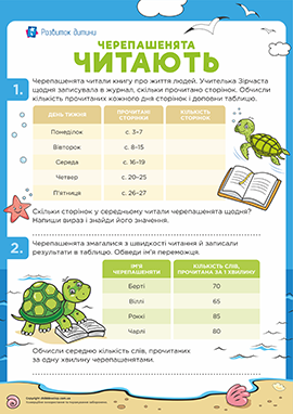 Завдання спрямоване на формування математичної компетентності, удосконалення вміння знаходити середнє значення кількох величин. У першому завданні дитині пропонується визначити кількість сторінок, прочитаних черепашенятами щодня, та обчислити середню кількість сторінок. У другому завданні – визначити середню швидкість читання черепашенят, що взяли участь у змаганнях із читання. Виконуючи це завдання, дитина розвиватиме логіку, увагу, пам’ять.