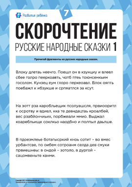 Завдання допоможе дитині покращити навички читання досить незвичним чином. Дитині даються фрагменти з російських народних казок в дещо зміненому вигляді, а саме пропонується лише верхня частина слів. Перед тим як приступити до виконання цього завдання, дитині рекомендується спочатку прочитати оригінальні фрагменти, що містяться в першому завданні. Попереднє ознайомлення з текстом допоможе впізнавати слова й окремі літери та пришвидшитись під час читання. Виконуючи завдання, дитина також тренуватиме увагу й пам’ять.