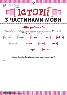 Це завдання покликано розвинути мовленнєву компетенцію, закріпити знання дитини про таку частину мови, як прикметник. Воно допоможе розвинути навички читання й письма. На сторінці дається перелік слів, з якого потрібно вибрати й обвести тільки ті слова, що є прикметниками (відповідають на питання «Який?»). Далі потрібно скласти з вибраними словами історію й записати її. Таким чином дитина збагатить свій словниковий запас, розвине навички зв’язного письмового мовлення та правопису, а також уяву й фантазію.