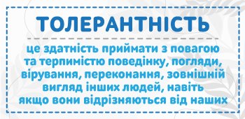 Толерантність – це здатність приймати з повагою та терпимістю поведінку, погляди, вірування, переконання, зовнішній вигляд інших людей, навіть якщо вони відрізняються від наших.