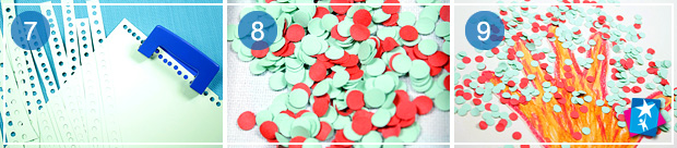 Далі, за допомогою діроколу, створюємо багато маленьких кружечків-конфетті. Для кожної пори року необхідно створити конфетті відповідного кольору: зима — білий або блакитний сніг (залежить від фону, щоб був контраст), весна — зелений колір, літо — зелене листя з червоними ягодами, осінь — відтінки жовтого, жовтогарячого.