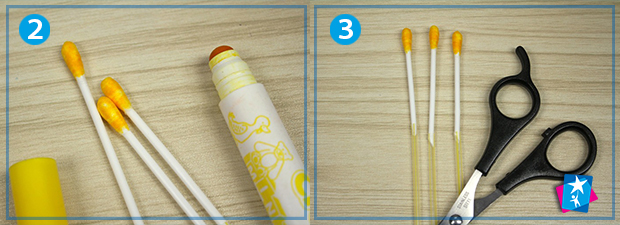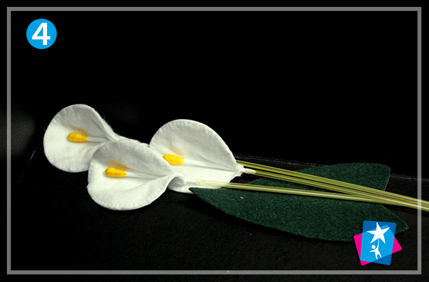Пофарбуйте кінчик ватної палички жовтим фломастером — це буде тичинка майбутньої квітки. Другий кінчик зріжте ножицями навскоси, щоб було загострення, а тоді вставте цим кінцем у тоненьку трубочку. Сформуйте пелюстку кали і зафіксуйте навкруги тичинки: якщо закріпляти степлером, вийде краще, оскільки пелюстка не буде рухатись. Але можна використовувати і клей.