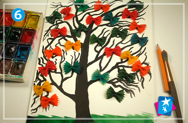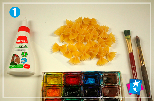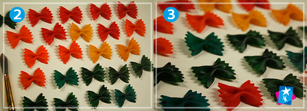 Розфарбуйте макарони в різні кольори, дайте їм висохнути. Швидко і просто створюються однотонні бантики, але ви можете вільно експериментувати з візерунками, наприклад, виставляти контрастні крапочки або проводити смужки на фоні.